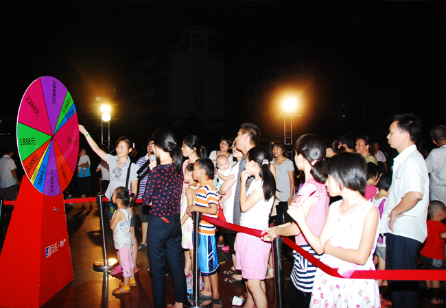 輪到一對(duì)夫妻上場(chǎng)開(kāi)始搖獎(jiǎng)了,“老婆”首先上場(chǎng)。用力一撥,轉(zhuǎn)盤(pán)開(kāi)始轉(zhuǎn)動(dòng)。“停”,一聲令下,轉(zhuǎn)盤(pán)“聽(tīng)話”地停在了“5888”的位置上。