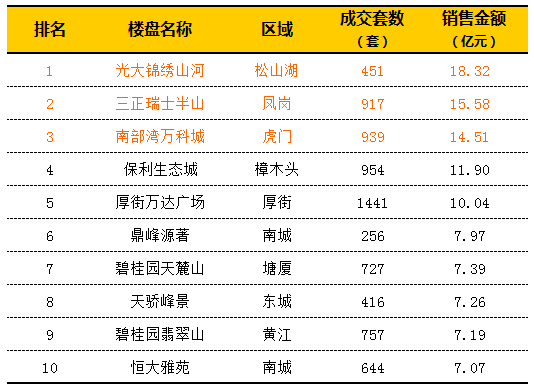 2014年,這些外地“大鱷”房企勢頭相當猛,前10熱銷樓盤中,萬科、萬達、保利、碧桂園和恒大等占據半壁江山。據東莞中原提供數據顯示,今年光大錦 繡山河單盤吸金18.32億元排名全市第一,三正瑞士半山以15.58億元排名第二,南部灣萬科城項目以14.51億元緊追其后,排名第三。