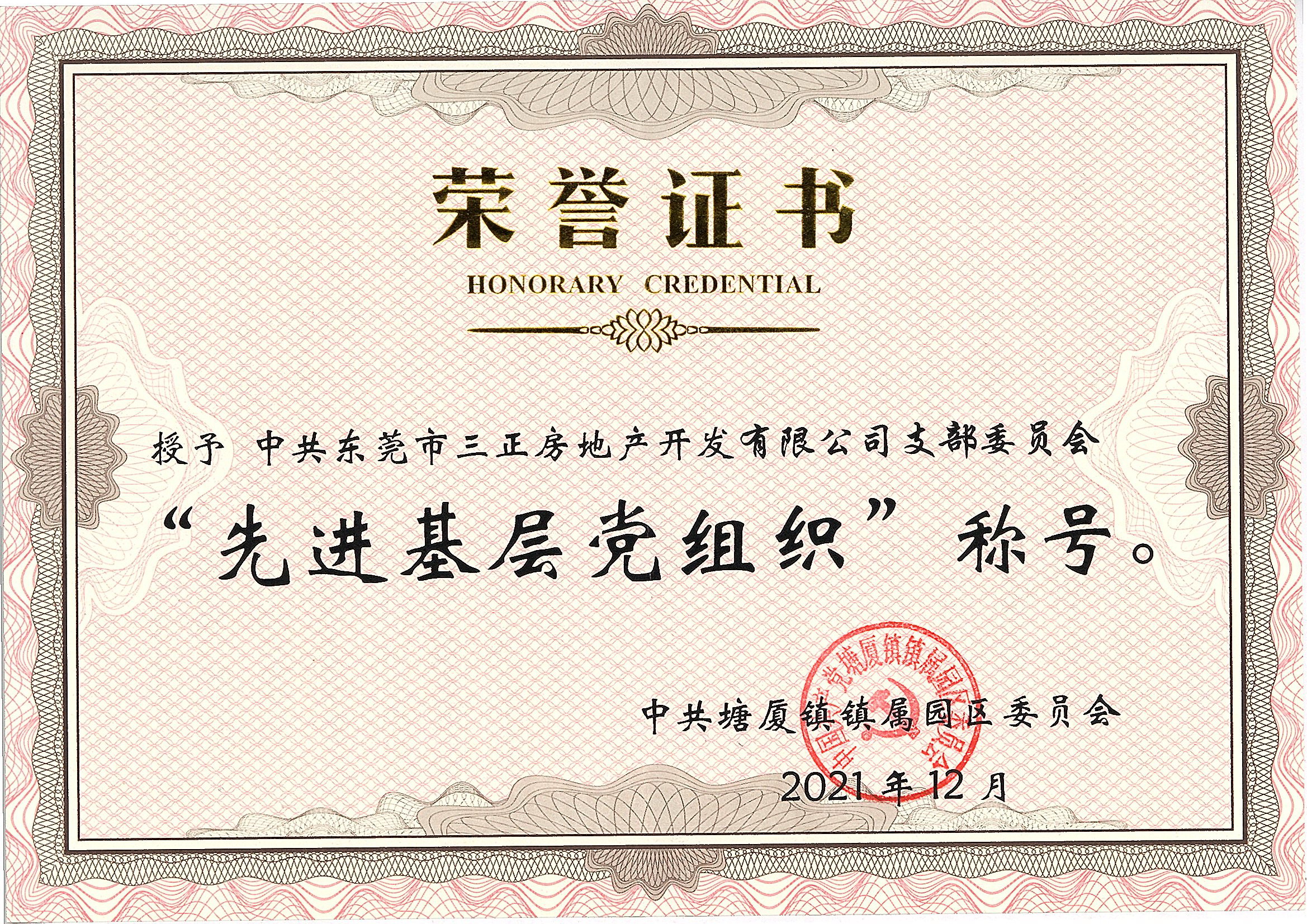 三正房地產黨支部獲得塘廈鎮2021年黨建工作先進集體先進“兩新”組織